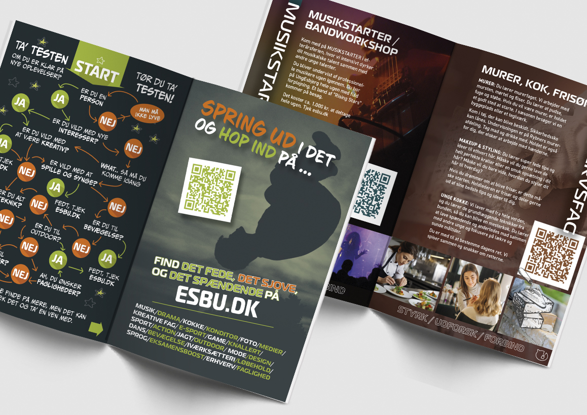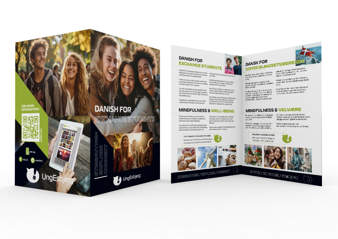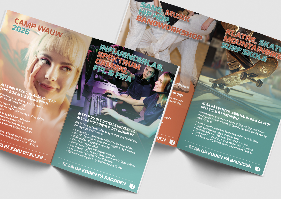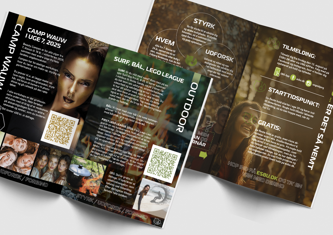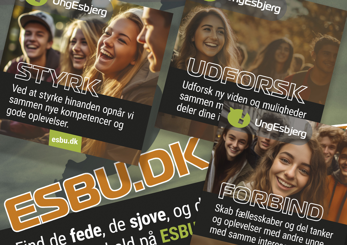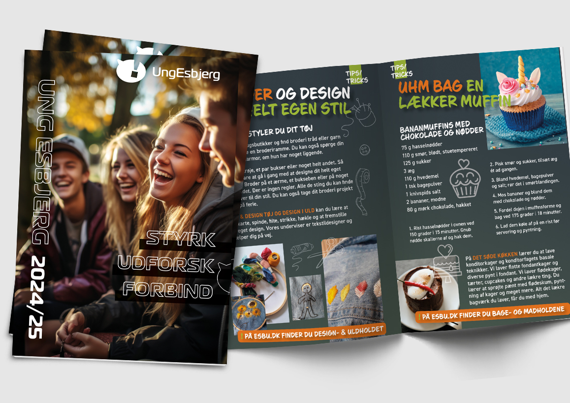 UngEsbjerg tilbyder fritidsundervisning til unge mellem 14 og 25 år i Esbjerg Kommune, med fokus på at styrke både faglige og kreative kompetencer. Programmet skaber samtidig et fysisk og socialt fællesskab – væk fra mobilen og sociale medier. Jeg er stolt af at have bidraget visuelt til et tilbud, der både lærer og samler unge på en meningsfuld måde.